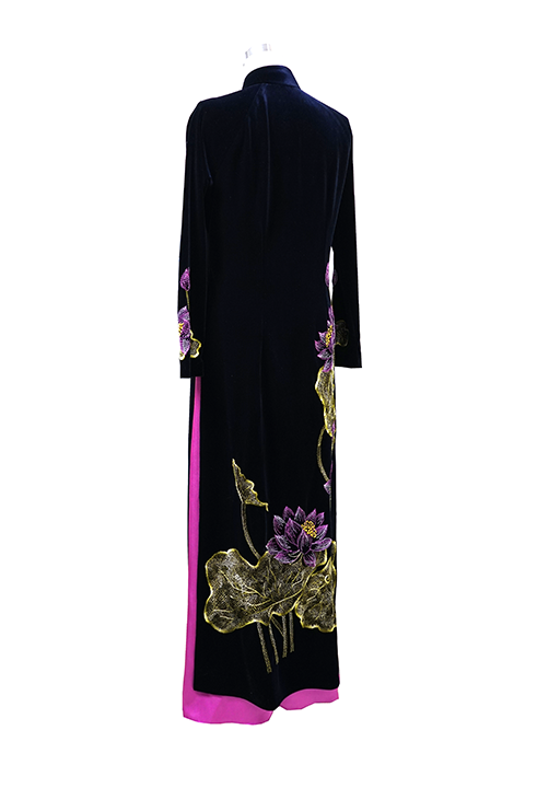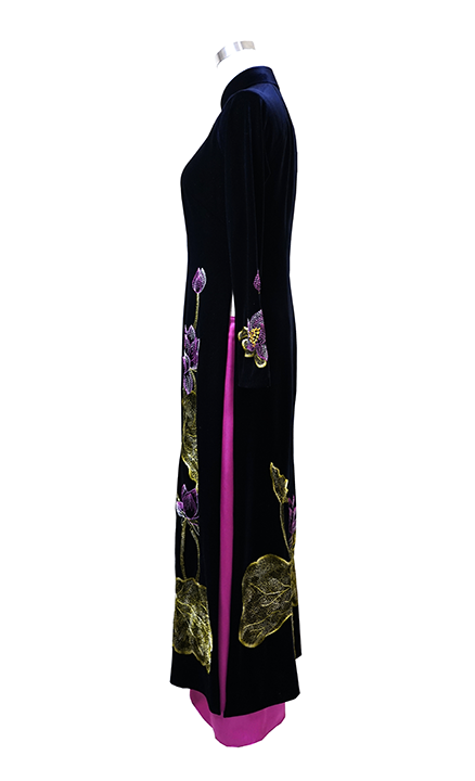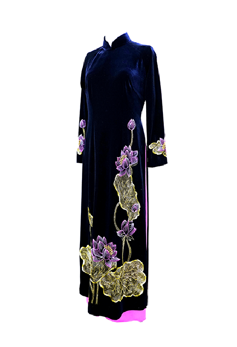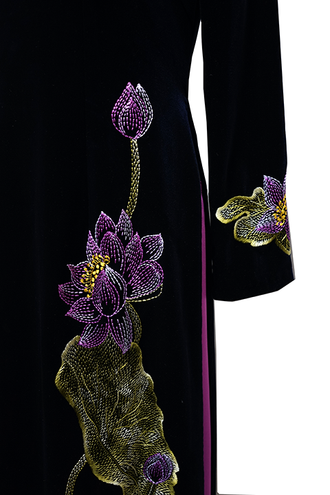 Chất vải nhung the cao cấp, màu đen, thêu tay hoa sen