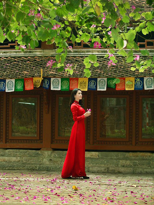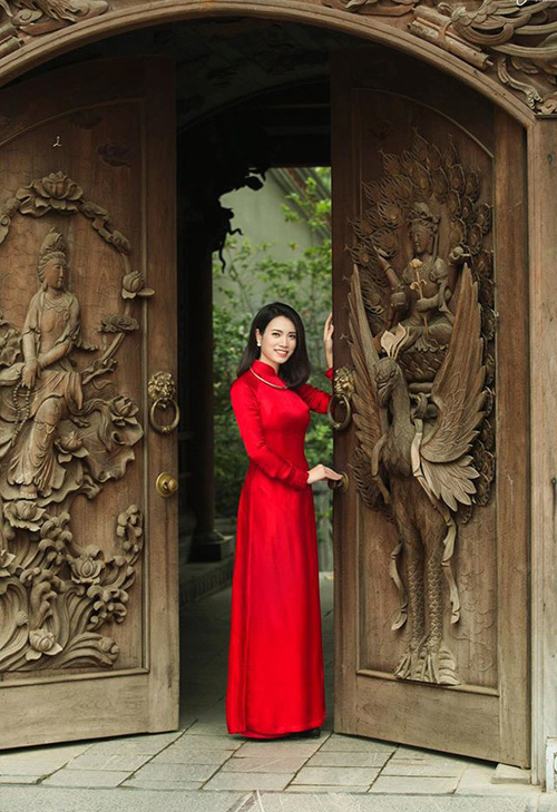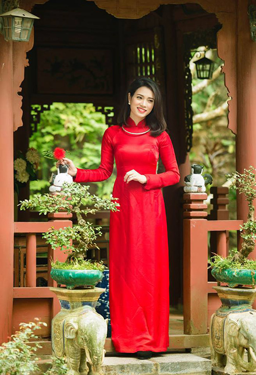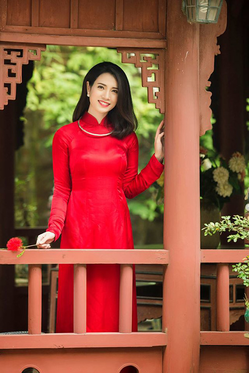 chị Phương chọn áo dài màu đỏ để mừng mùa Xuân sang