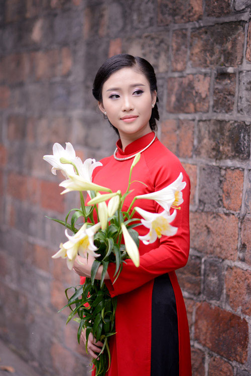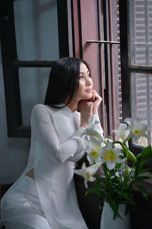 Áo dài chất liệu lụa bay bổng tôn đường cong khiến chủ nhân thu hút và ấn tượng hơn bên sắc trắng hoa loa kèn. (Xem thêm: Những mẫu áo dài lụa đẹp nhất hiện nay)