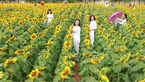 Vườn hướng dương vàng rực thu hút du khách ở đủ mọi lứa tuổi, với nhiều "concept" chụp hình và trang phục khác như: Từ áo dài cho tới trang phục bình thường, năng động... Mọi thứ đều phù hợp để tạo dáng bên loài hoa này.