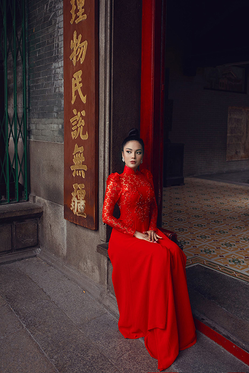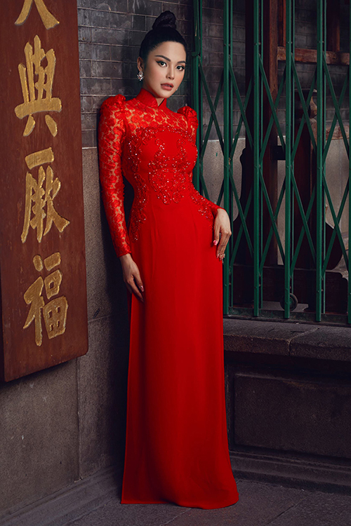 Nếu như áo dài trắng mang phong cách thanh lịch, dịu dàng còn áo dài đen gợi vẻ bí ẩn thì thiết kế màu đỏ tay bồng mang đến vẻ cổ điển, điệu đà.