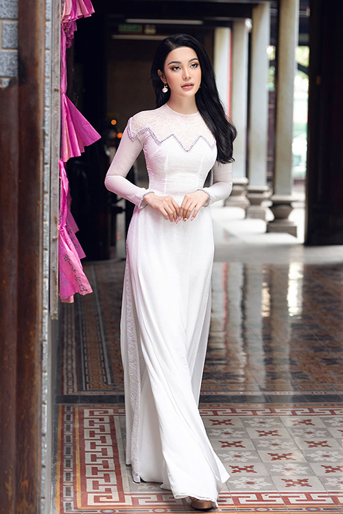 Phần đắp ren kết hợp chi tiết đính đá ở vai trở thành điểm nhấn, giúp tà áo dài trắng không bị đơn điệu. Chất liệu voan mỏng giúp mỗi bước đi của người đẹp thêm thướt tha, uyển chuyển.