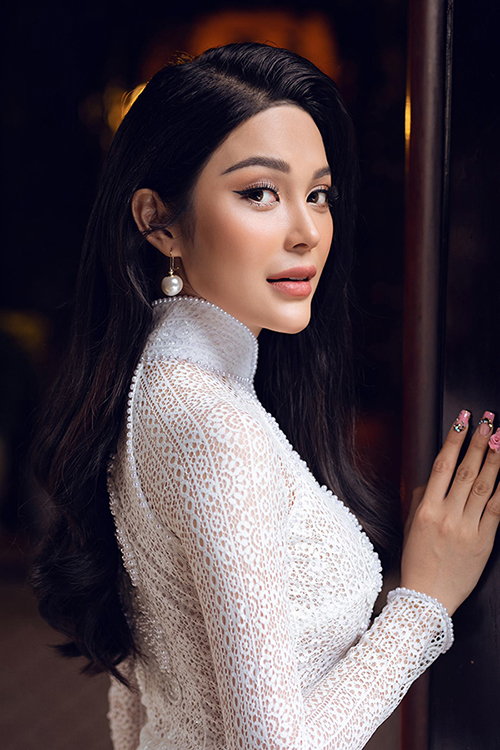 Là ca sĩ chuyên trị dòng nhạc Bolero, Lily Chen rất yêu thích áo dài và thường mặc trang phục truyền thống mỗi lần lên sân khấu. Cô khéo léo khoe thân hình đồng hồ cát với áo dài chất liệu co giãn nhẹ.