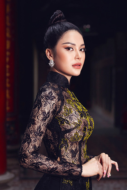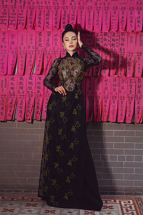 Với áo dài đen đính kim sa, Lily Chen để tóc búi cao và trang điểm nhấn vào đôi mắt sắc để hoàn thiện vẻ cá tính.