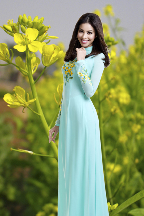 Phạm Hương với áo dài xanh thiên thanh được trang trí hoa cải vàng