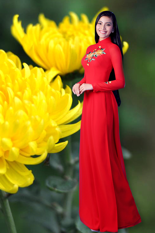 Á hậu Trương Thị May rực rỡ với áo dài đỏ được thêu hoa cúc vàng.