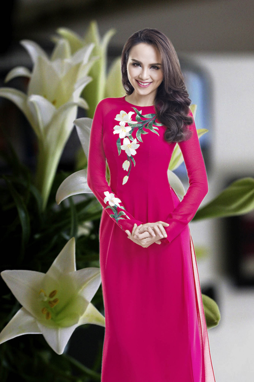 Hương Giang khoe vẻ đẹp đằm thắm với áo dài cổ trụ được trang trí hoa sen, loài hoa thường nở rộ vào tháng 5.