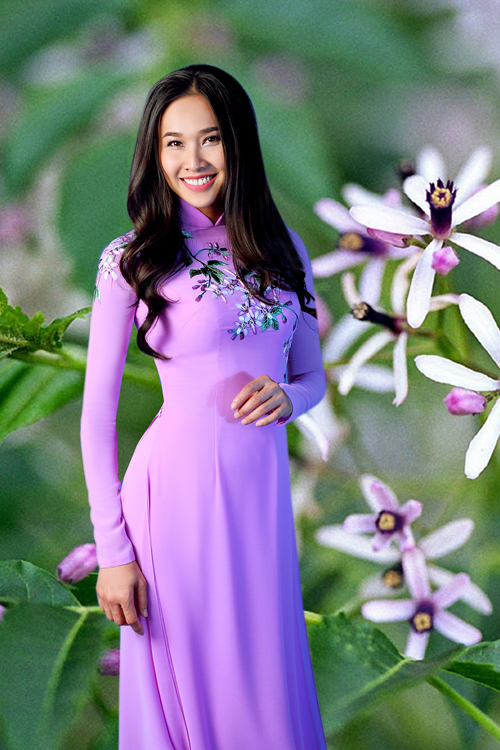 Tông tím hồng mộng mơ xen trắng thanh nhã của hoa xoan mang đến mẫu áo dài đầy nữ tính cho Dương Mỹ Linh