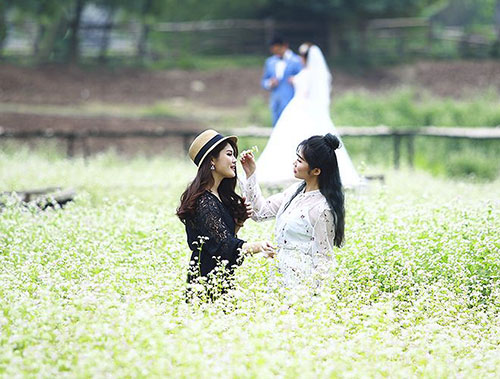 Các bạn trẻ tạo dáng bên những cành hoa tam giác mạch