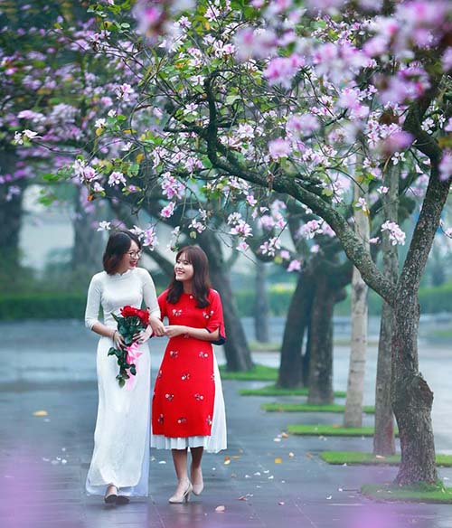 Người dân hà nội đổ xô đi chụp ảnh áo dài với hoa ban tại đường bắc sơn