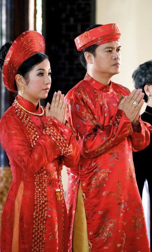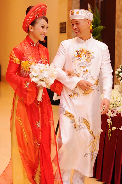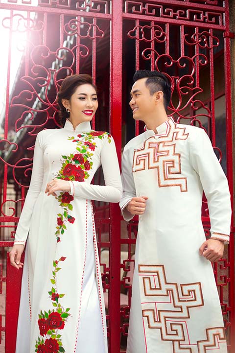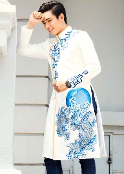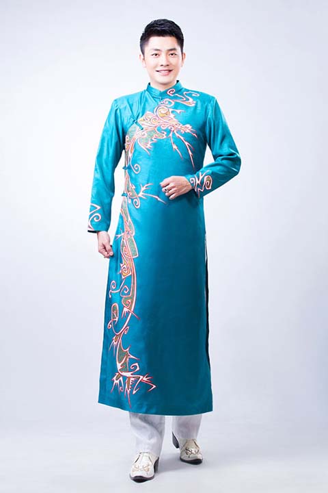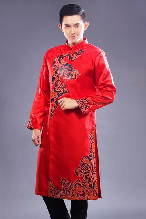 So với cô dâu được tha hồ chọn lựa những mẫu áo dài bắt mắt, lộng lẫy hay dịu dàng e ấp thì áo dài truyền thống được thiết kế cho chú rể có phần hạn chế hơn. Thông thường các chú rể thường chọn áo dài màu đỏ, xanh, trắng, ánh kim….Tùy theo sở thích hay để phù hợp với trang phục của cô dâu mà chú rể có thể chọn cho mình áo dài có màu sắc và hoạt tiết phù hợp. Đa phần áo dài nam truyền thống vẫn thiên về vẽ hình con rồng để làm nổi bật sự mạnh mẽ.