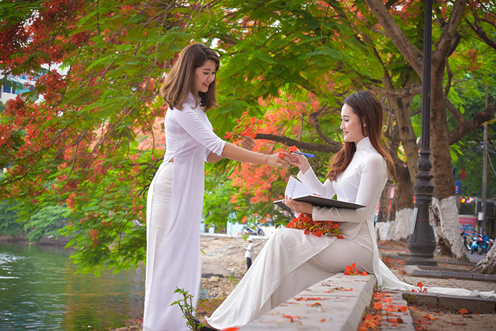 Các cô gái Hà Nội hồn nhiên, mơ màng trong tà áo dài trắng tinh khôi, trở về những phút giây học trò tươi đẹp, đáng nhớ bên màu đỏ thắm thương yêu của phượng hè.